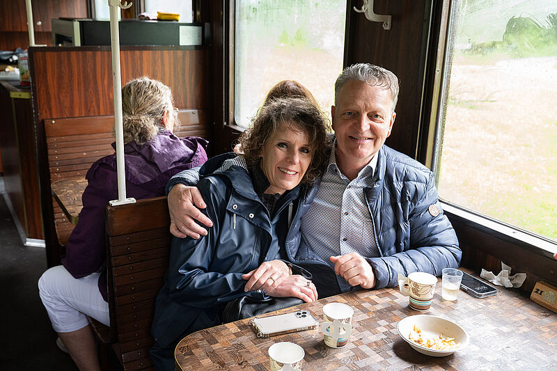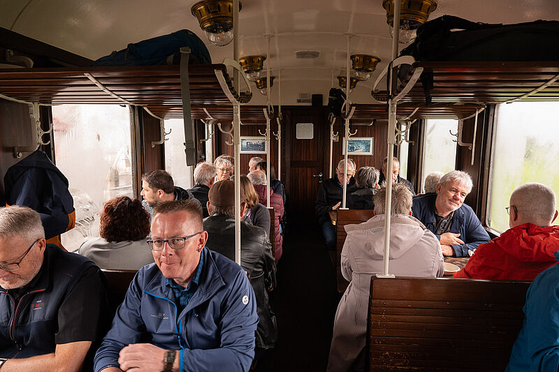 Am anschliessenden Morgen startete das optionale Samstagsprogramm. Um 10 Uhr fuhren rekordverdächtige 100 Teilnehmende mit einem historischen Zug aus der Belle Epoque, Baujahr 1913, durch die jurassischen Freiberge von Saignelégier nach Bollemont und zurück. Auf der Fahrt durch den Schweizer «Wilden Westen» konnten die Gäste die wunderbare Szenerie geniessen. Doch plötzlich knallte es – und das waren keine Champagnerkorken! Schüsse? Eine Bande von berittenen Gangstern tauchte auf, enterte den Zug und überrumpelte die Passagiere. Ehe man sich’s versah, waren eine mitreisende Ehefrau und zwei Ehrenmitglieder als Geiseln gefangen genommen – denn für diese erhofften sich die Gangster das grösste Lösegeld. Da sich die Fahrgäste bei der Lösegeldsammlung nicht lumpen liessen, kamen die Geiseln wieder frei und alle Passagiere wohlbehalten an ihrem Ziel an. Ein stärkendes Mittagessen brachte nach diesem Schrecken den Puls wieder in die Normalzone, womit die AM Suisse-Delegiertenversammlung auch 2024 wieder ein gutes Ende nahm.