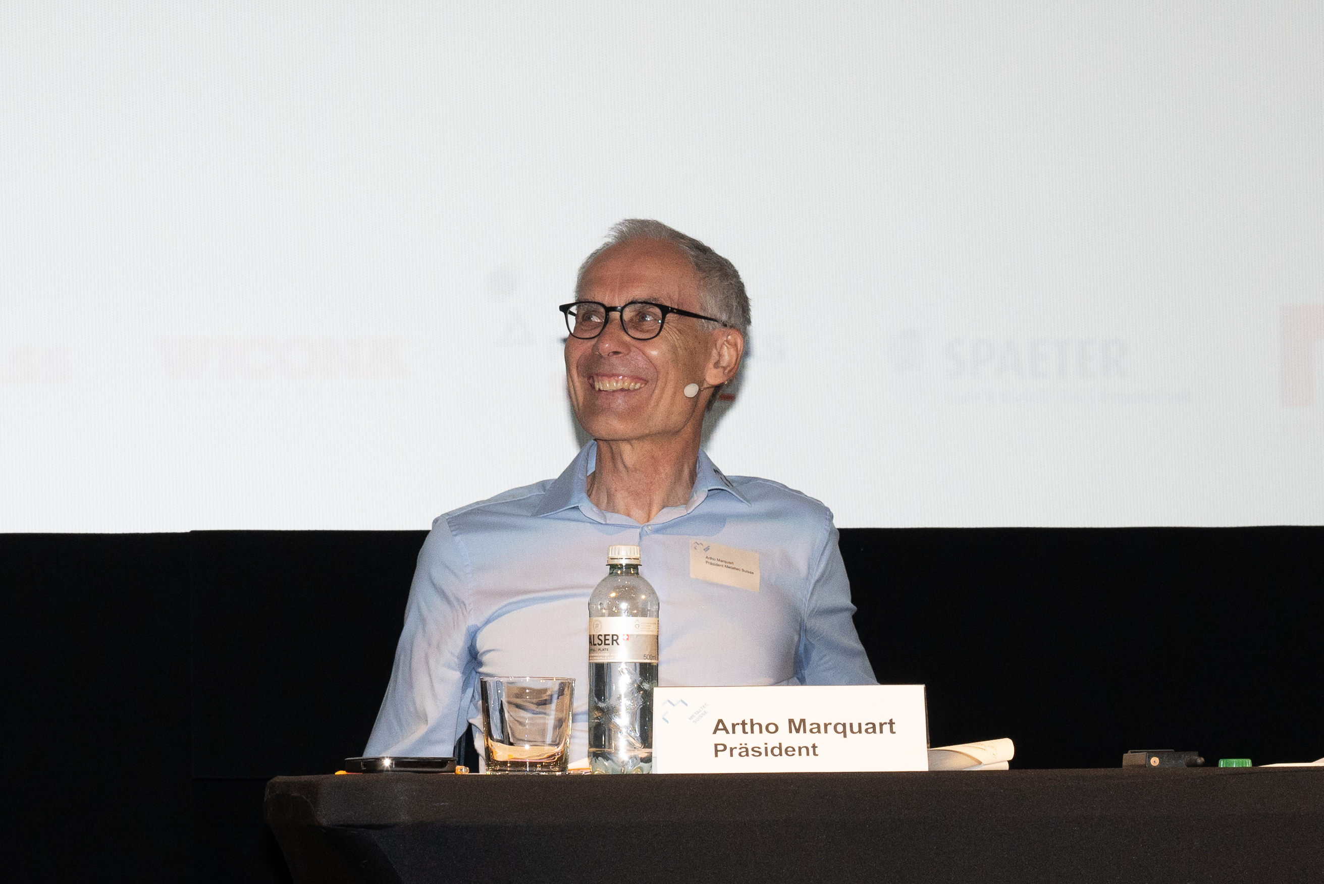 Artho Marquart blickte abschliessend auf seine mit dem heutigen Tag endende Amtszeit im Vorstand nach fast zwanzig Jahren Verbandstätigkeit zurück. Zum Abschied wünschte er seinem Nachfolger Oliver Däschler sowie Niklas Dula gutes Gelingen. Nach seinem Dank an alle Referenten, Teilnehmenden, Verbandskollegen und Mitarbeitenden resümierte Anita Tschopp das Schaffen des abtretenden Präsidenten in einer Laudatio, garniert mit humorvollen Anekdoten und Fotos. Neben einem Hotelaufenthalt in Vals wurde Artho Marquart zum Abschied ein Korb mit regionalen Spezialitäten aus der Heimatregion jedes Vorstandsmitglieds geschenkt.